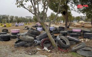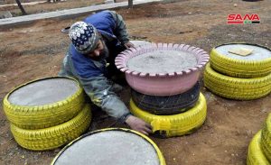 نفذت جمعية أصدقاء سلمية ومؤسسة الآغا خان أعمالاً ومبادرات لتأهيل الحديقة العامة في مدينة السلمية بريف حماة الشرقي من خلال الاستفادة من تدوير توالف البيئة وإطارات السيارات.