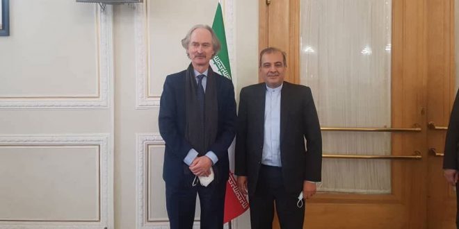 وقال كبير مستشاري وزير الخارجية الإيراني للشؤون السياسية الخاصة علي أصغر خاجي خلال لقائه اليوم في طهران مبعوث الأمم المتحدة الخاص إلى سورية غير بيدرسون إن “إيران دعمت وتدعم دوما جهود الأمم المتحدة لتعزيز السيادة الوطنية وسلامة أراضي سورية وتشجيع الحوار السوري السوري وإرساء دعائم السلام والاستقرار فيها”.