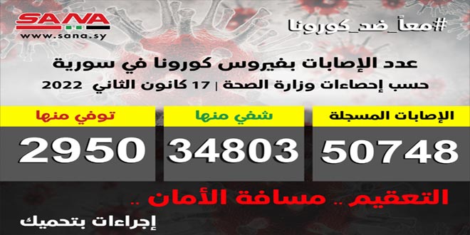 وأوضحت الوزارة في بيان تلقت سانا نسخة منه أن عدد الإصابات المسجلة في سورية بلغ حتى الآن 50748 حالة شفي منها 34803 حالات وتوفي 2950 حالة.