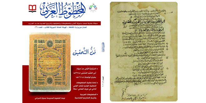 يشار إلى أن المخطوط العربي مجلة علمية نصف سنوية تعنى بالمخطوطات وتحقيقها وتاريخ العلوم عند العرب بهدف تلبية حاجة القراء والمهتمين بنصوص التراث العربي والكشف عن كنوزه المخبوءة في مكتبات العالم.