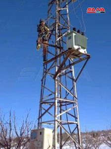 مدير شركة الكهرباء المكلف المهندس محمد ابراهيم أوضح في تصريح لمراسل سانا أن الورشات استكملت إصلاح الأعطال التي لحقت بالمنظومة الكهربائية جراء غزارة الثلوج وقوة الرياح حيث تم استبدال محولة باستطاعة 100 ك.ف.أ في بلدة خان أرنبة وإصلاح شبكة التوتر المتوسط والمنخفض في بلدة حضر كما تم الانتهاء من إصلاح الأعطال بمحطة تحويل القنيطرة وإجراء أعمال الصيانة اللازمة لها إضافة إلى إصلاح وصيانة على مخارجها الممتدة إلى حضر وخان أرنبة وأيوبا والرفيد وجبا وتمت إعادة التيار الكهربائي إلى كل بلدات وقرى المحافظة.