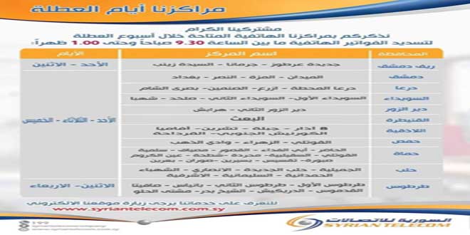 أعلنت الشركة السورية للاتصالات استمرارها باستقبال الراغبين بتسديد فواتيرهم الهاتفية مستحقة الدفع عن شهري أيلول وتشرين الأول للعام 2021 خلال أيام العطلة الرسمية من اليوم وحتى الـ 27 من الشهر الجاري ضمن مراكزها المحددة والمدرجة على صفحتها الرسمية على موقع التواصل الاجتماعي فيسبوك.
