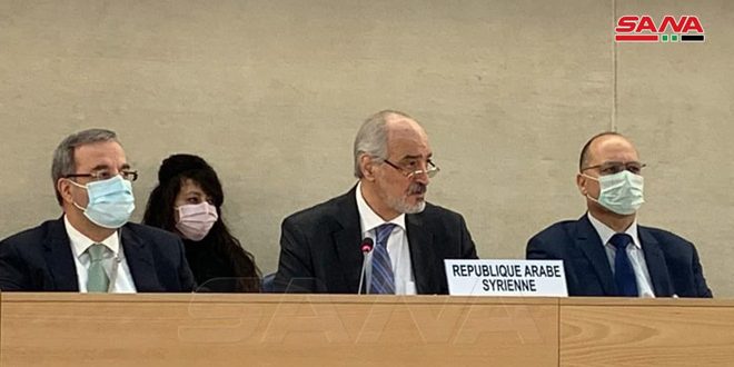 وبين الجعفري أنه مع مرور سنوات عديدة على بداية الأزمة في سورية من الضروري التذكير بأن سورية تواجه منذ عام 2011 حرباً إرهابية ممنهجة واحتلالاً أجنبياً لجزء من أراضيها مع استمرار وجود دعم خارجي للمجموعات الإرهابية وكان لهذه التحديات الجسيمة تداعيات كارثية على حالة حقوق الإنسان في سورية وزاد من حدتها وتفاقمها فرض إجراءات قسرية أحادية الجانب من دول غربية في مقدمتها الولايات المتحدة والاتحاد الأوروبي مشيراً إلى أنه مع التشدد والتوسع بهذه الإجراءات رغم تداعيات جائحة كوفيد 19 تحولت إلى إرهاب اقتصادي تمثل بفرض حصار شامل استهدف المواطن السوري بحقه في الحياة والعيش الكريم والصحة والتعليم والتنمية بأشكالها كافة علاوة على استخدام الاحتلال التركي للمياه كسلاح وأداة للابتزاز والضغط السياسي الأمر الذي يرقى إلى مستوى جريمة ضد الإنسانية وحدت هذه التدابير بقوة من إمكانيات الدولة للقيام بالمهام المنوطة بها بالشكل الأمثل لحماية مواطنيها ورغم هذه التحديات الجسيمة تحملت الدولة مسؤولياتها وواجبها للحفاظ على سيادتها وتحرير أراضيها ومكافحة المجموعات الإرهابية والاحتلال الأجنبي والحفاظ على أمن وحياة مواطنيها منذ بداية الأزمة.