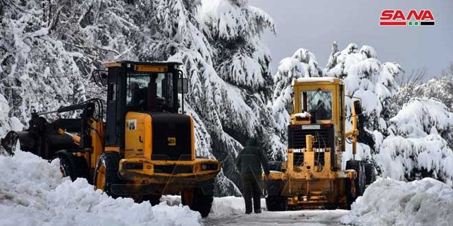 من جهته بين المهندس أمين العيسى مدير الخدمات الفنية في حمص أن ورشات المديرية بدأت بالتنسيق مع الوحدات الشرطية منذ الصباح الباكر بإزالة الثلوج المتراكمة على ثلاثة محاور رئيسية هي محور ضهر القصير باتجاه الحدود الإدارية لمحافظة طرطوس حتى بلدة عيون الوادي مرورا بقريتي طريز والبطار بمسافة أكثر من 10 كم ومحور بيدر الرفيع قرب علي “الناصرة” ومحور “ضهر القصير باتجاه رباح القبو ومنها إلى حمص.