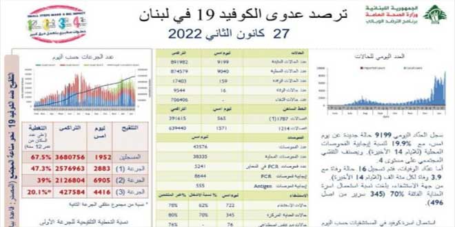 وأوضحت الوزارة في تقريرها اليومي أنه تم تسجيل 16 وفاة و 9199 إصابة جديدة بالفيروس خلال الساعات الأربع والعشرين الماضية ليرتفع إجمالي الإصابات المؤكدة في لبنان منذ بدء تفشي الوباء إلى 891982 إصابة والوفيات إلى 9544 حالة.