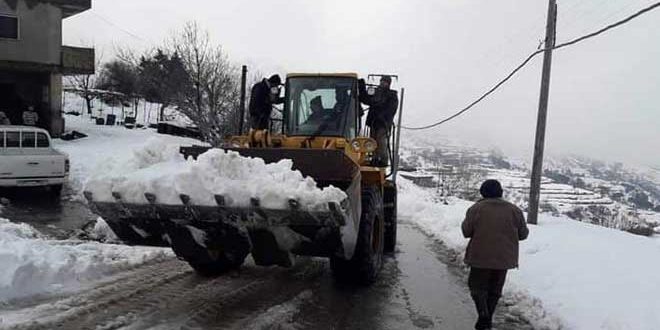 واصلت ورشات وآليات مديرية الخدمات الفنية في محافظة طرطوس العمل على فتح الطرقات في المناطق التي تراكمت فيها الثلوج وخاصة في المناطق الجبلية بريف المحافظة.