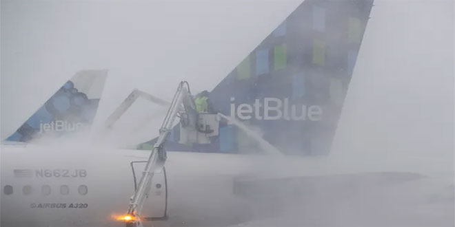 ألغيت آلاف الرحلات الجوية في الولايات المتحدة اليوم تحسباً لعاصفة شديدة متوقعة شرق البلاد يرافقها تساقط ثلوج ورياح قوية.