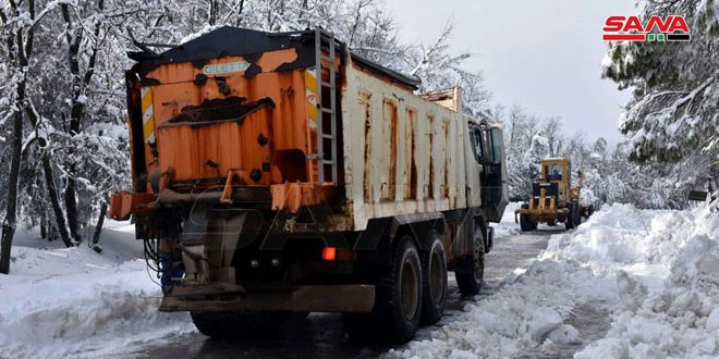 أنهت آليات وورشات مديرية الخدمات الفنية بحمص صباح اليوم أعمال إزالة الثلوج المتراكمة في عدة مناطق بريف حمص الغربي وفتح كل الطرق.