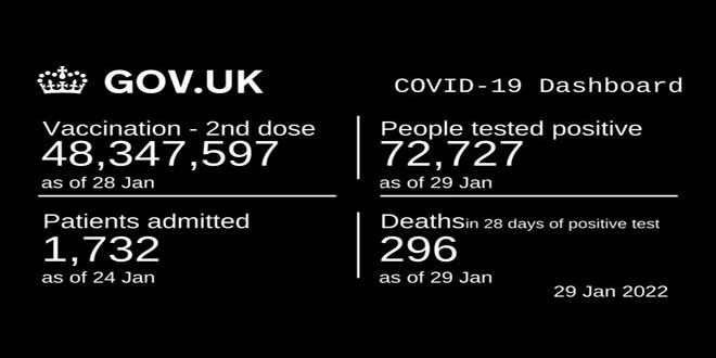 ووفق بيانات رسمية بلغ إجمالي الإصابات بالفيروس في بريطانيا 16 مليوناً و406 آلاف 123 إصابة في حين وصل العدد الكلي للوفيات إلى 155613 حالة.