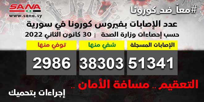 وأوضحت الوزارة في بيان تلقت سانا نسخة منه أن عدد الإصابات المسجلة في سورية بلغ حتى الآن 51341 شفي منها 38303 حالة وتوفي 2986 حالة .