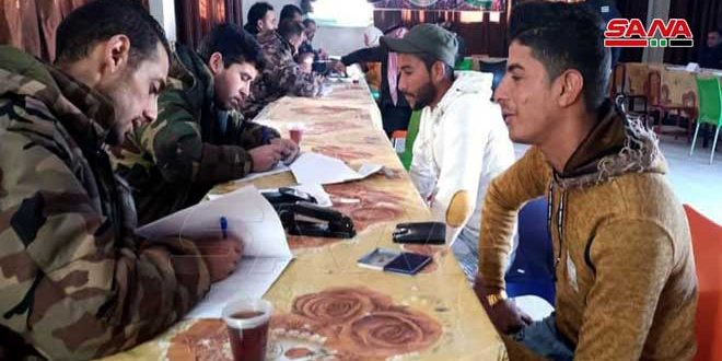 وذكر مراسل سانا في حلب أن “عدداً من المطلوبين المدنيين والمتخلفين عن الخدمة العسكرية الإلزامية والاحتياطية والفارين سووا أوضاعهم اليوم قادمين من مختلف قرى وبلدات ومناطق المحافظة أغلبهم من مناطق سيطرة ميليشيا “قسد” والتنظيمات الإرهابية التابعة للاحتلال التركي إيذاناً بعودتهم إلى حياتهم الطبيعة والتحاق العسكريين والمتخلفين والفارين منهم بصفوف الجيش العربي السوري لأداء واجبهم الوطني في الدفاع عنه”.