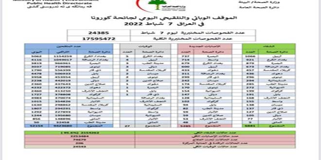 وذكرت وزارة الصحة العراقية في بيان اليوم أن إجمالي عدد الوفيات في البلاد بلغ 24543 والإصابات 2253484 والمتعافين 2154262 شخصاً .