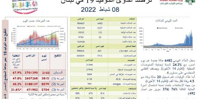 سجلت وزارة الصحة اللبنانية 20 وفاة و 6482 إصابة جديدة بفيروس كورونا خلال الساعات الأربع والعشرين الماضية.