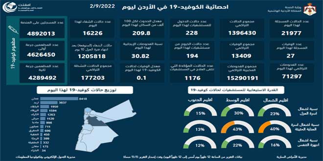 وذكرت وزارة الصحة الأردنية في تقريرها اليومي أن العدد الإجمالي للإصابات بالفيروس ارتفع إلى 1396430 إصابة والوفيات إلى 13409 حالات بينما بلغ مجموع المتعافين 1205818 شخصاً.