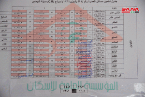 من جانبه لفت مدير المؤسسة العامة للإسكان المهندس مازن اللحام إلى أن عملية التخصيص بدأت في كل من المحافظات المذكورة دمشق وريفها والقنيطرة وحلب وحمص في الوقت نفسه وتم تخصيص ريف دمشق بـ 2080 شقة مشيراً إلى أن عملية التخصيص في محافظات اللاذقية ودير الزور والسويداء وحماة تبدأ الأسبوع القادم.