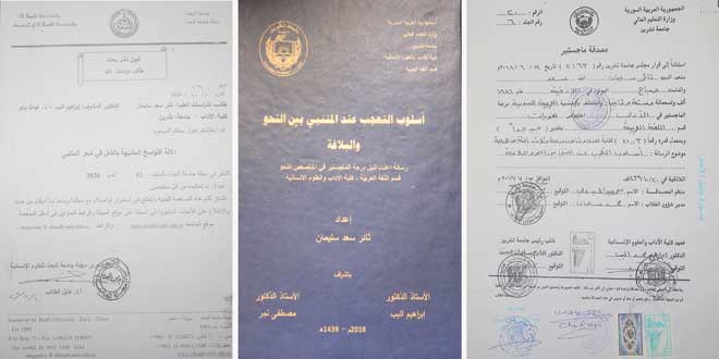 وبين سليمان أنه التحق بقسم اللغة العربية في كلية الآداب والعلوم الإنسانية بجامعة تشرين وتابع تحصيله العلمي وحصل على درجة الماجستير من خلال أطروحة بعنوان “أسلوب التعجب عند المتنبي.. بين النحو والبلاغة” كما نال الدكتوراه بدرجة جيد جداً عن أطروحته بعنوان “أساليب الاستفهام في شعر المتنبي.. دراسة تركيبية دلالية”.