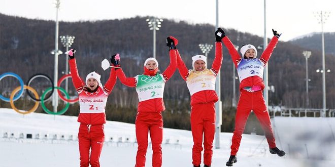 توج فريق السيدات الروسي بالميدالية الذهبية الثالثة في سباق التتابع بالتزلج في أولمبياد بكين.