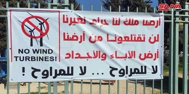 جدد أهلنا في الجولان السوري المحتل رفضهم القاطع إقامة الاحتلال الإسرائيلي توربينات هوائية على آلاف الدونمات من أراضيهم مطالبين المجتمع الدولي وفي مقدمته الأمم المتحدة بوقف هذا المخطط الاستيطاني الرامي لتهجيرهم والذي يشكل انتهاكاً سافراً لقرارات الشرعية الدولية.