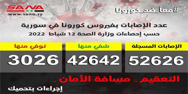 وأوضحت الوزارة في بيان تلقت سانا نسخة منه أن عدد الإصابات المسجلة في سورية بلغ حتى الآن 52626 شفيت منها 42642 وتوفيت 3026 حالة.