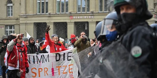 وأكدت الشرطة السويسرية إلقاءها القبض على مجموعة كبيرة من المتظاهرين من المحتمل أن تكون عنيفة من أفراد حركة يمينية متطرفة في زوريخ القديمة.