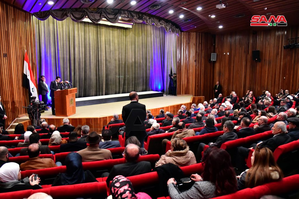 وقال الدكتور الحلاق:”هنا دمشق عبارة أعلنت ولادة إذاعة دمشق .. 75 عاماً وما زالت إذاعة شابة لم تفقد جمالها وكبرياءها ولا يزال ألقها يتسابق مع زمن الحداثة والتطور ولم تكتف يوماً بالصوت بل كانت على الدوام ترسم الصور على صفحات الذاكرة وقدمت منذ انطلاقتها إعلاما وطنياً لعب دوراً كبيراً في تشكيل الوعي والوجدان وتنوير العقل ولا تزال حتى اللحظة ككل وسائل الإعلام الوطني تخوض معركة الوعي بمهنية ومصداقية في مواجهة حرب إعلامية شرسة تستهدف الدولة والمجتمع عبر محاولات حثيثة لتغيير المفاهيم وكسر المبادئ الوطنية وهذا ما عجزت عن تحقيقه الجيوش الإرهابية”.