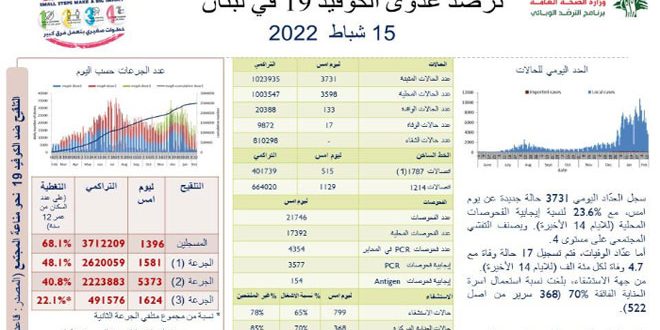 وسجل لبنان أمس 15 وفاة و3717 إصابة بالفيروس.