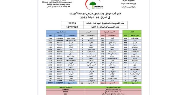 وذكرت وزارة الصحة العراقية في تقريرها اليومي “إن إجمالي الإصابات بكورونا في البلاد وصلت إلى 2284205 والوفيات إلى 24792 حالة والمتعافين إلى 2204814 شخصاً.