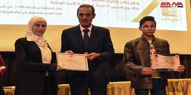 كرمت وزارة التربية اليوم الطلاب الفائزين بمسابقة القراءة السريعة بدورتها الرابعة وعدداً من المدربين المشرفين من مختلف المحافظات بالتعاون مع مؤسسة إضاءات الفكر ودار الفكر للطباعة والنشر وذلك في مكتبة الأسد الوطنية بدمشق.