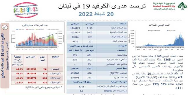 سجلت لبنان 20 حالة وفاة و3145 إصابة جديدة بفيروس كورونا خلال الساعات الأربع والعشرين الماضية.