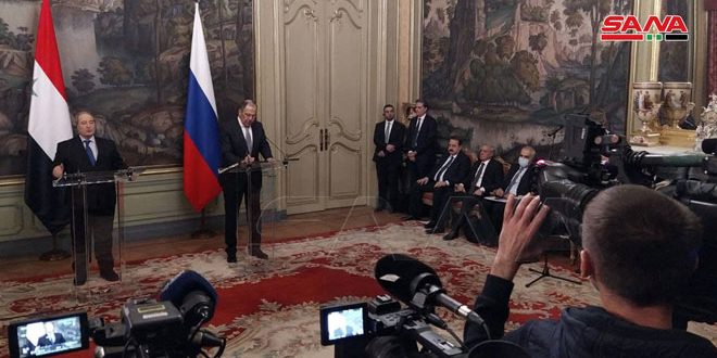 من جهته قال لافروف: “بحثت مع المقداد موضوع المساعدات الإنسانية والخطط المشتركة في مجالات التعاون الثنائي مثل الثقافي والعلمي والعسكري والتبادل الإنساني وأكدت حرص موسكو على مواصلة هذا التعاون في اطار اللجنة الحكومية المشتركة الروسية السورية إضافة للتطرق إلى ملفات إقليمية وعالمية كما أولينا الاهتمام الأساسي لبحث تحقيق التسوية الشاملة وضرورة حل الأزمة سياسياً وفق حوار سوري سوري بعيداً عن أي تدخل خارجي وبناء على القرار الأممي 2254” مشدداً على ضرورة عدم فرض شروط مسبقة على عمل لجنة مناقشة الدستور أو تحديد أطر زمنية مصطنعة لها.