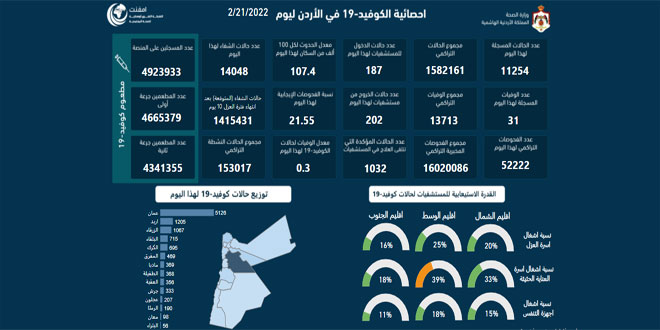 وذكرت وزارة الصحة الأردنية في موجزها اليومي أن إجمالي عدد الإصابات بالفيروس بلغ 1582161 والوفيات 13713 والمتماثلين للشفاء 1415431 شخصاً في البلاد.