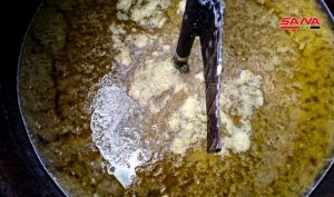 وعن مراحل العمل لفت ملحم إلى أنه يضع الزيت في البرميل ويوقد النار حتى وصول الزيت لدرجة الغليان ثم يحل نترات الصوديوم بالماء الساخن ويضيفها إلى الزيت ويحرك المزيج لمدة ساعة ونصف الساعة ثم يسكبه في قوالب خاصة لمدة4 ساعات حتى يبرد وفي اليوم التالي يقوم بتقطيعه لألواح صغيرة ويتركه ليجف في الهواء لمدة أسبوع ثم يسوقه في قريته والقرى المجاورة التي يوجد لديه زبائن فيها.