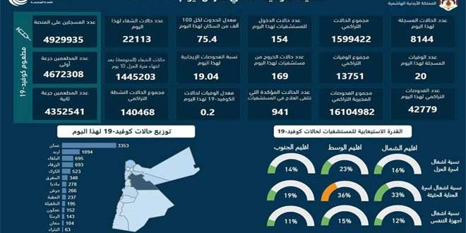سجل الأردن 20 وفاة و8144 إصابة جديدة بفيروس كورونا خلال الساعات الأربع والعشرين الماضية.