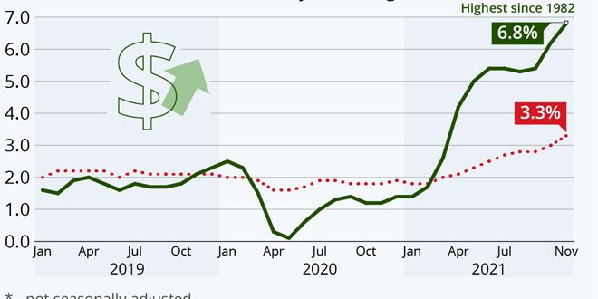ونقلت شبكة “سي ان بي سي” الأمريكية عن وزارة التجارة قولها إن مؤشر أسعار نفقات الاستهلاك الشخصي الأساسي وهو مقياس التضخم الأساسي لدى مجلس الاحتياطي الفيدرالي ارتفع خلال شهر كانون الثاني الماضي بنسبة 5.2 بالمئة عن العام الماضي أي أعلى قليلاً من تقديرات الخبراء البالغة 5.1 بالمئة وهو المستوى الأعلى منذ عام 1983.