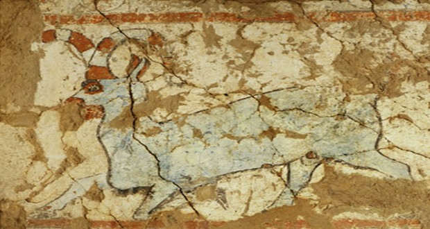 وخير مثال على ذلك كما يقول المؤرخ الدكتور محمود السيد قارئ النقوش الكتابية القديمة في المديرية العامة للآثار والمتاحف الرسوم المكتشفة في تل أحمر /بارسيب/ على الضفة اليسرى لنهر الفرات على بعد نحو عشرين كيلومتراً إلى الجنوب من الحدود التركية ومنها رسم جداري يصور ماعزا.. اللوحة كانت جزءاً من إفريز وهي واحدة من الأمثلة النادرة في الشرق القديم للرسوم التي زينت بها القصور الآشورية تنسب إلى العصر الأشوري الحديث القرن الثامن ق.م اكتشفت في موقع تل أحمر /بارسيب/ خلال أعمال التنقيب التي جرت في الفترة الواقعة ما بين 1929-1931 وتسمى اللوحة التيس الأزرق, لكنها تجسد على الأرجح الماعز البري.. اللون الأزرق المستخدم في تلوين الرسم هو صباغ أزرق مصري وهو مصنوع من مزج سيليكات الكالسيوم والنحاس استخدم هذا الصباغ كتقليد لحجر اللازورد ..اللون الأسود مصنوع من فحم حيواني أو نباتي واللون الأحمر مصنوع من المغرة الحمراء /أكسيد الحديد/ و اللون الأبيض مصنوع من حجر الجير.