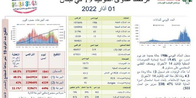 وسجل لبنان أمس 12 حالة وفاة و1870 إصابة بكورونا.
