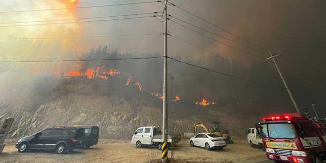 واضطر نحو 6000 شخص للفرار من منازلهم حيث امتد الحريق على جبل في بلدة أولجين الساحلية جنوب شرق العاصمة سيئول إلى مدينة سامشوك بإقليم كانغ وون وما وراءها.
