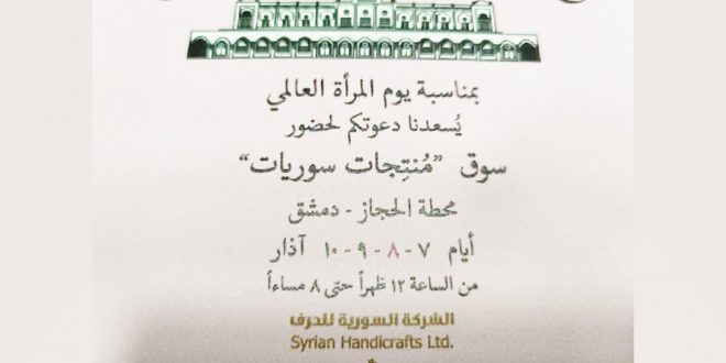 احتفاء بعيد المرأة العالمي تشارك أكثر من 25 سيدة من كل المحافظات في سوق “منتجات سوريات” الذي سيفتتح غداً في محطة الحجاز بدمشق ويستمر لأربعة أيام.