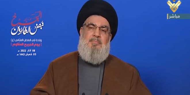 وأشار السيد نصر الله إلى أن الخضوع للإملاءات الأمريكية لن ينقذ لبنان بل سيزيد من مآسيه ومصائبه ولن يستطيع المسؤولون اللبنانيون إرضاء أمريكا لأن لا حدود لمطالبها معتبراً أن موقف لبنان الرسمي في الأمم المتحدة عبر التصويت مع أمريكا غير موفق ولا سيما أن لبنان كان يستطيع أن يكون ممتنعاً ومصلحته كانت في الامتناع.
