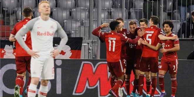 حجز بايرن ميونخ مقعده في ربع نهائي دوري أبطال أوروبا لكرة القدم بعدما فاز على ضيفه ريد بول سالزبورج النمساوي 7-1 في مباراة احتضنها ملعب أليانز أرينا في إياب دور الـ16.