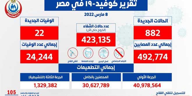 أعلنت وزارة الصحة والسكان المصرية تسجيل 22 حالة وفاة و 882 إصابة جديدة بفيروس كورونا خلال الساعات الأربع والعشرين الماضية.