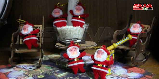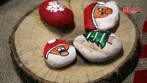 ميس العيد من منطلق حبها للزينة وتعبيراً عن فرحتها بالأعياد والمناسبات تضع لمساتها الفنية على الأقمشة والزجاج وجذوع الأشجار والأشياء التالفة مستخرجة منها زينة في غاية الإتقان حيث قالت في تصريح لمراسل سانا: “أحضر للاعياد والمناسبات وأصنع من توالف البيئة أشياء مفيدة وبأقل التكاليف” مبينة أن العمل مشترك بينها وبين أولادها الذين يساعدون بأعمال الرسم والتلوين.