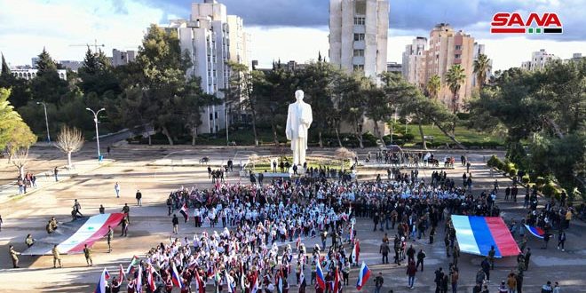 أمين فرع جامعة دمشق لحزب البعث العربي الاشتراكي الدكتور خالد الحلبوني قال في تصريح لـ سانا “جئنا لنؤكد وقوفنا مع روسيا شعباً وجيشاً وقيادة ضد النازية الجديدة ولنوجه رسالة وفاء للشعب الروسي الذي وقف إلى جانب الشعب السوري في حربه ضد الإرهاب “مبيناً أنه من حق روسيا أن تدافع عن أمنها القومي في مواجهة محاولات الناتو للتمدد.