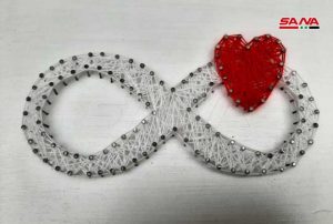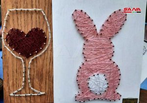 ولفتت إنجي لمراسل سانا إلى أنها تقوم بشراء الألواح الخشبية الكاملة وقصها عند النجار بالأشكال التي تريدها ثم طلائها والرسم عليها بأدوات بسيطة تتمثل بالمسامير الصغيرة والخيطان المتنوعة مع إنارة بعض القطع أحياناً لتقوم فيما بعد بتسويقها إما من خلال وسائل التواصل الاجتماعي أو عبر المشاركة بالمعارض أو بناء على الطلبات المقدمة لها.