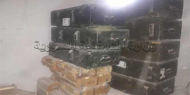 وأوضحت وزارة الداخلية في بيان تلقت سانا نسخة منه أن عناصر شرطة ناحية أفاميا تمكنت من ضبط مستودع يحوي صناديق ذخيرة ضمن أحد المنازل المهجورة في قرية كفرنبودة بريف المحافظة وهي عبارة عن 73 صندوقاً خشبياً تحتوي طلقات من عيارات مختلفة وحشوات قاذف RPJ.