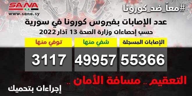 وأوضحت الوزارة في بيان تلقت سانا نسخة منه أن عدد الإصابات المسجلة في سورية بلغ حتى الآن 55366 شفي منها 49957 وتوفي 3117.