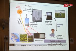 واستعرض المشاركون في الورشة أوراقاً علمية ومحاضرات حول تطبيقات الاستشعار عن بعد في مجالات الأراضي ولا سيما فيما يخص تقدير رطوبة التربة ومراقبة العواصف الغبارية وكذلك في مجال الغابات والحرائق والمراعي وتدهور الأراضي والمحاصيل ومراقبة الجفاف في سورية.