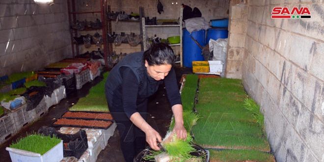 مشروع ناجح أنجزته هناء ابراهيم شعبان من قرية برابو بريف حمص وهو عبارة عن استنبات الشعير دون تربة ما حقق لها وفرة بالمنتج وتخفيف الأعباء المادية المترتبة على تربيتها للأبقار.
