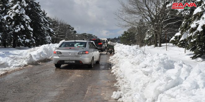أعلنت إدارة المرور في وزارة الداخلية أن عدداً من الطرق في محافظات ريف دمشق وحمص واللاذقية وحماة والقنيطرة والسويداء سالكة بصعوبة بسبب تراكم الثلوج وتشكل الجليد.
