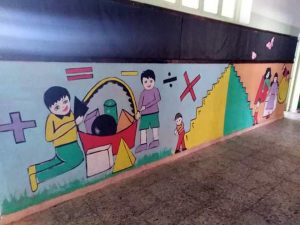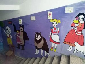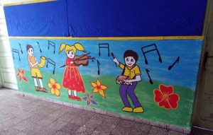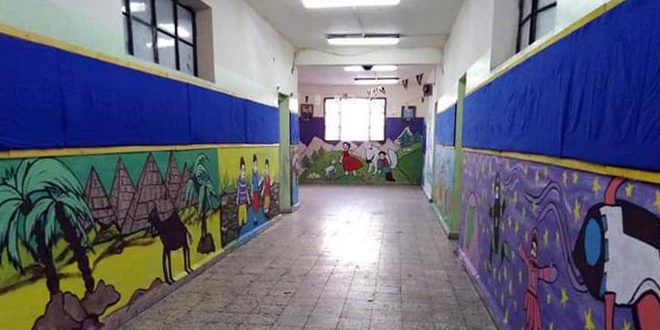 استطاعت معلمة الرسم والأعمال اليدوية منار شفيق علي بجهود مشتركة مع طلابها أن تترجم شغفها بالرسم إلى لوحات تزين كامل جدران مدرسة الشهيد علي خازم تامر في قرية القطيلبية بريف جبلة.